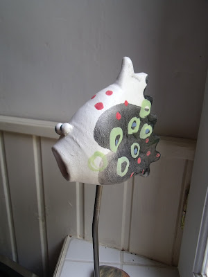 But we did get a fish, a fish on a stick! from Valerie Bacon who we've bought a vase from previously when we visited Saint Jean de Fos 'the village of potters'. So he is now residing on the kitchen window sill.